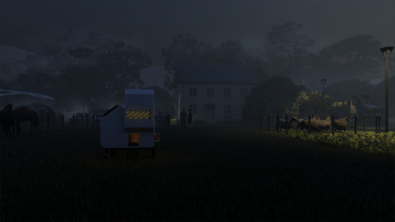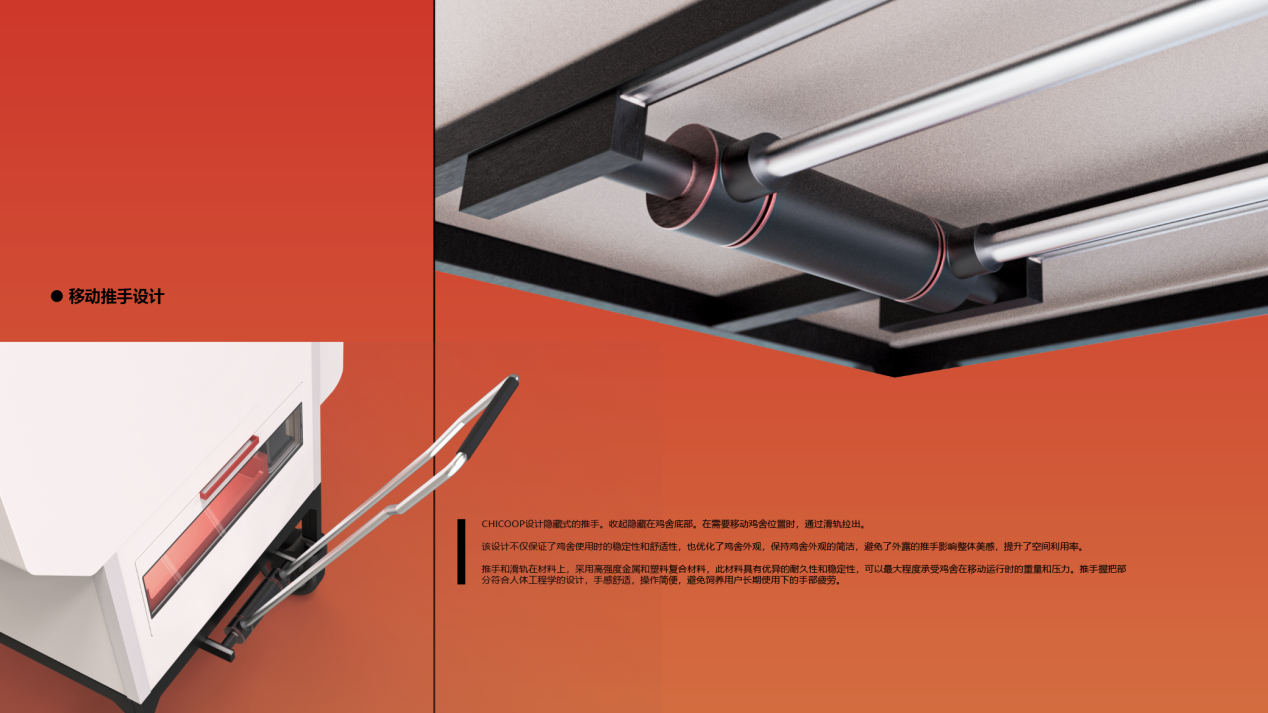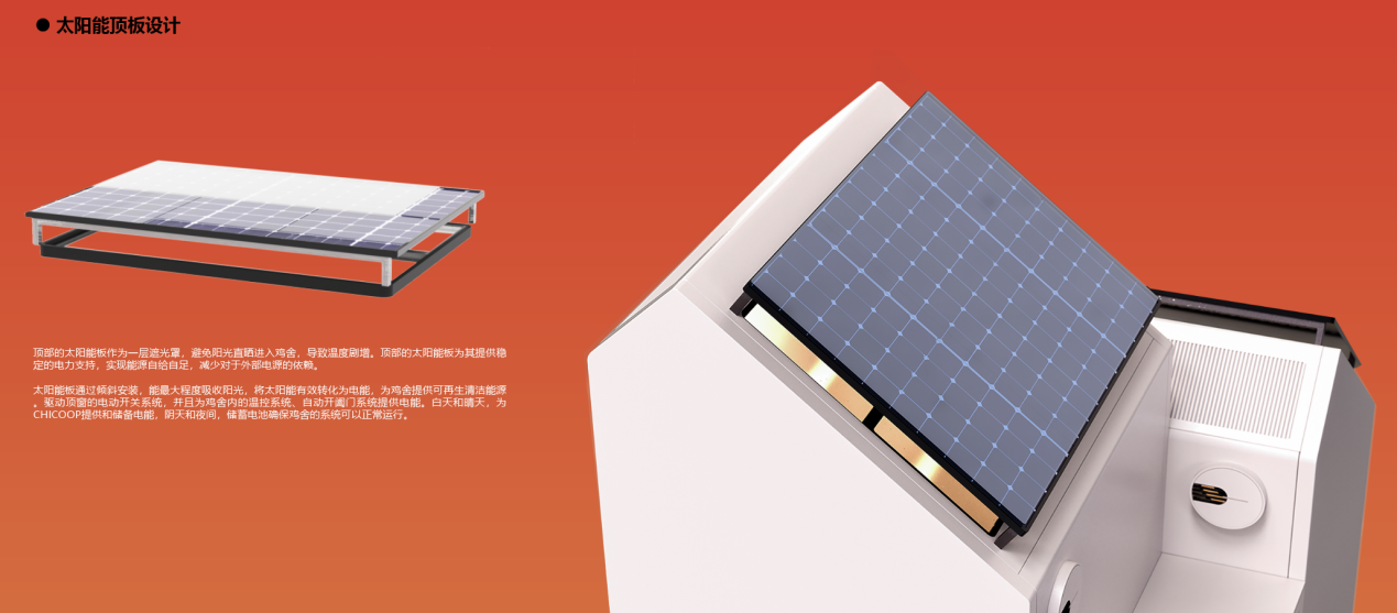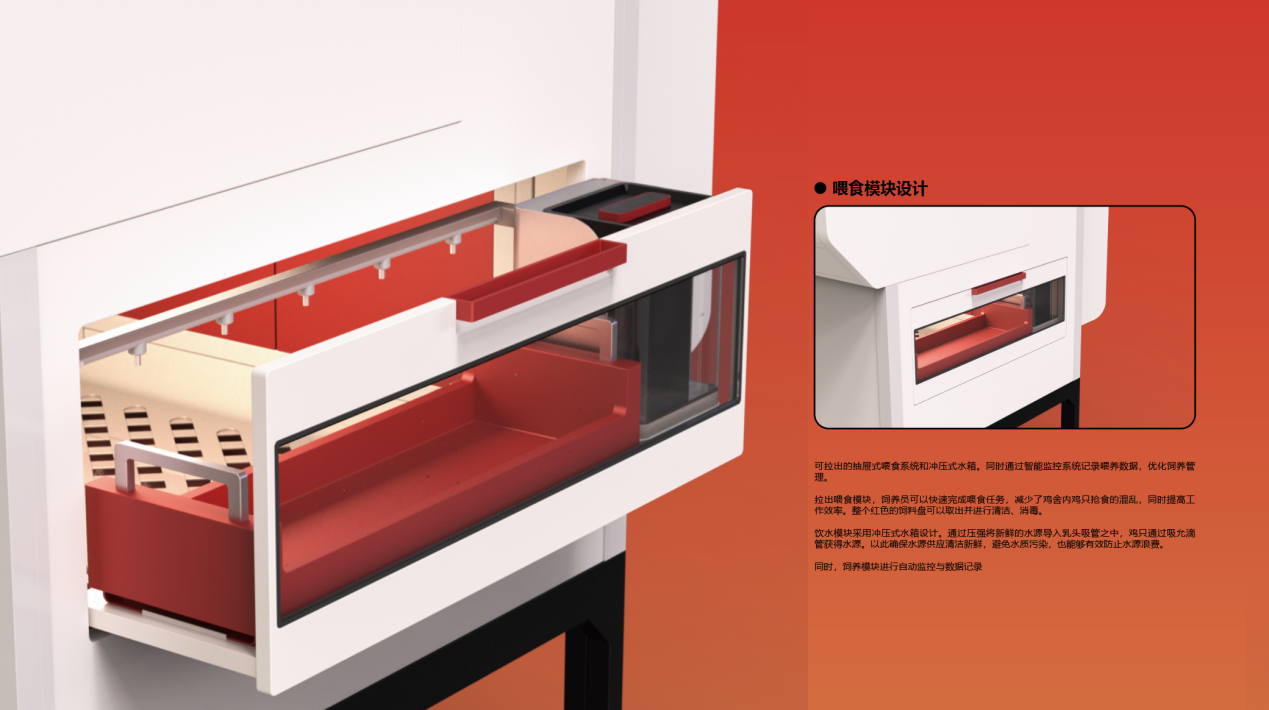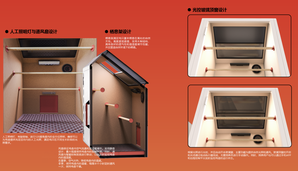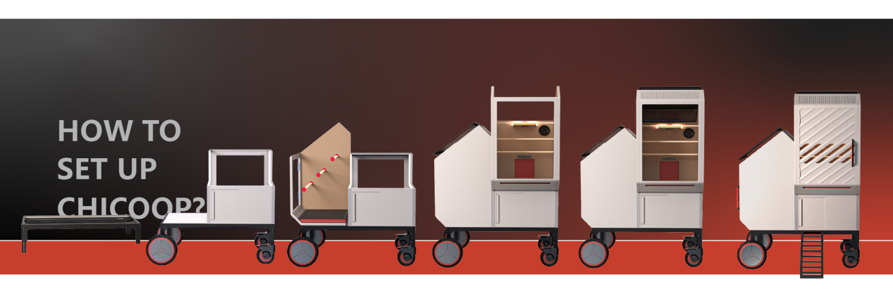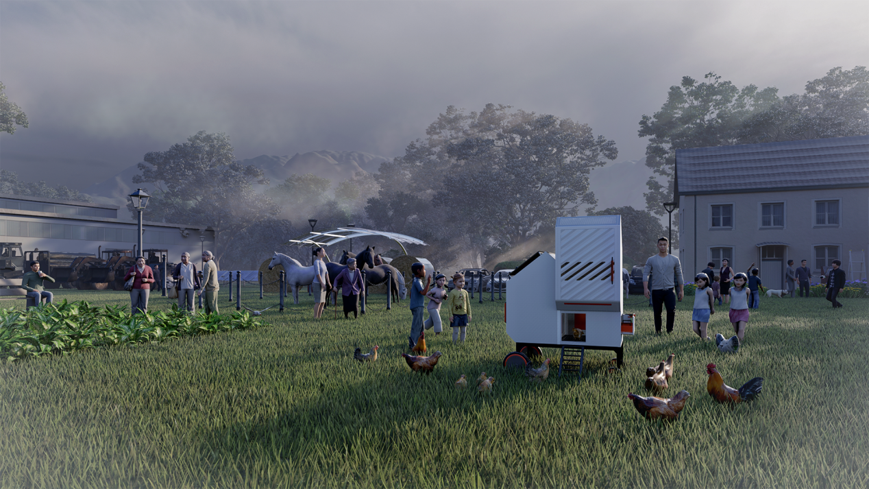 本设计响应了国家战略和农业现代化需求,聚焦城郊农家后院的散养鸡场景,是以鸡只行为与生理需求为核心,融合智能与体验经济的鸡舍设计方案。 CHICOOP探索的不只是怎么养鸡更高效,而是让传统的饲养设备能变成一个集生产和互动体验于一体的多功能空间,是一条更生态、更智能的现代养鸡路径。它不仅是饲养工具,更是现代生态农庄的一部分。在关注生产系统优化的同时,介入城乡关系,融合生产与体验。
