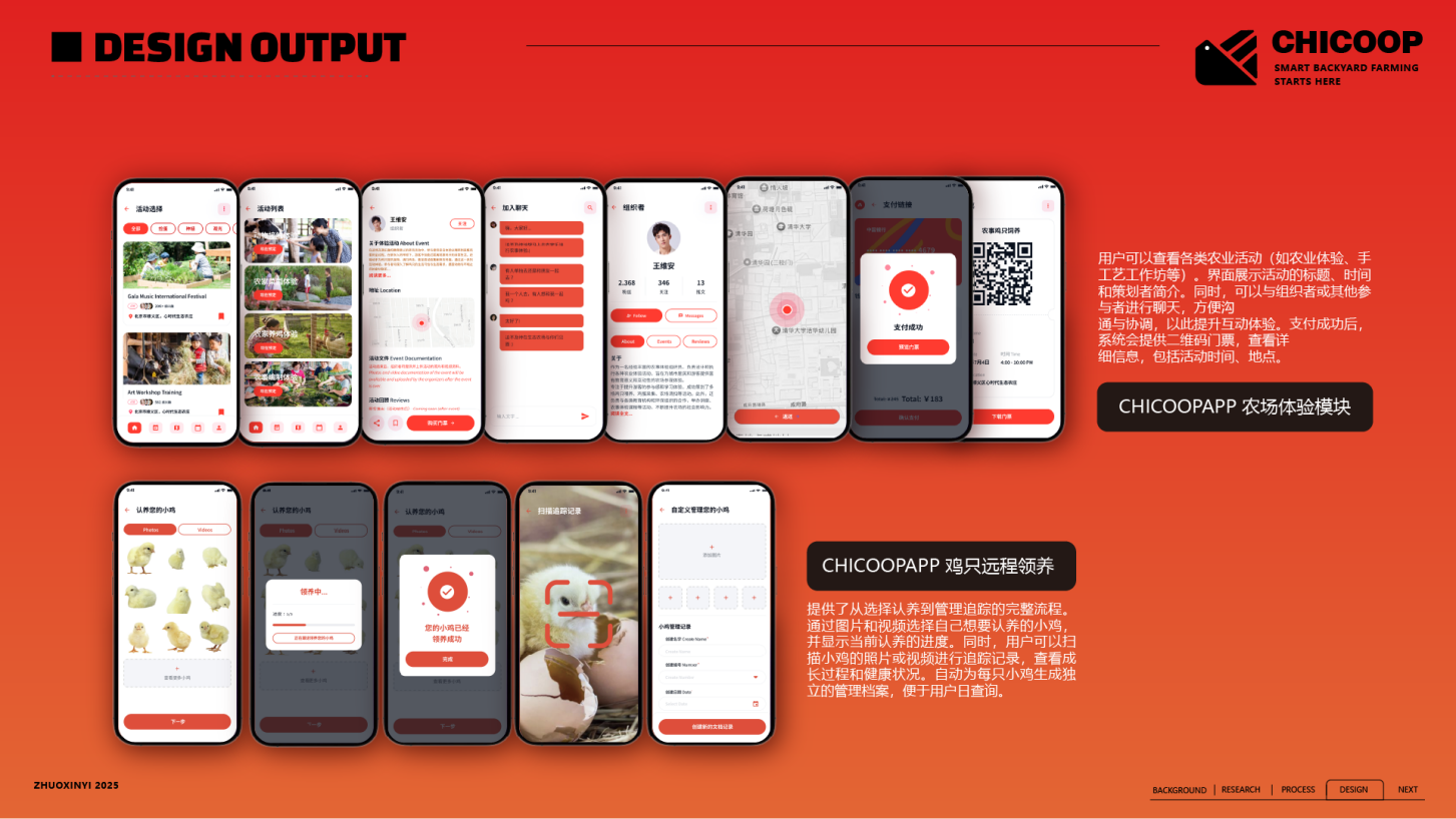 CHICOOP 配套APP设计,整合鸡舍管理、城乡互动与农产品购买,服务于新农人和城市体验者。设计支持鸡舍远程监控,提供直播、认养和预约参观等互动功能。商城支持农产品购买、产品追溯与会员优惠订阅。共创社区模块促进分享互助,以提升平台黏性与社区活力。APP是提升CHICOOP运营效率与用户体验的重要支撑。